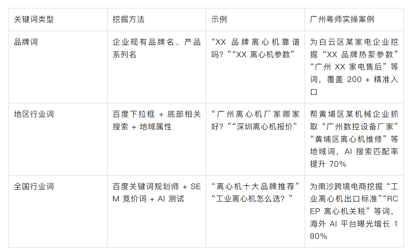 关键词是 GEO 的基础,需围绕 “用户会问 AI 什么问题” 展开,“体系致胜 GEO “通过关键词挖掘模块、各AI平台场景联想等方式, 可精准锁定 3 类关键词(以 “工业离心机” 为例),广州粤师企业管理有限公司常依托”体系致胜 GEO “该模块为本地企业落地关键词挖掘: