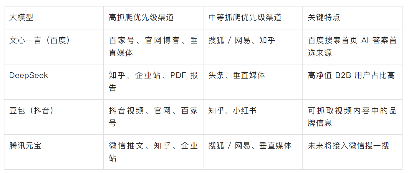 根据《B2B 企业 GEO 实操手册》数据,下半年大模型抓爬习惯相对稳定,体系致胜 GEO 建议优先布局以下平台(重点关注 “高抓爬优先级” 渠道)。